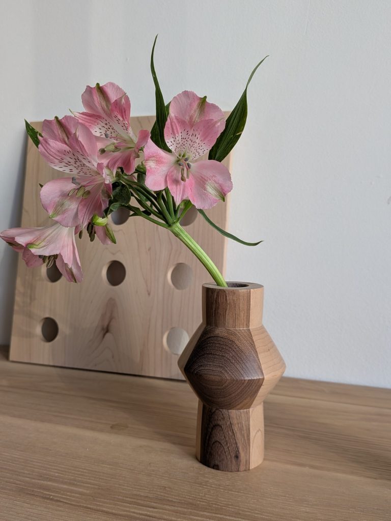 hand-turned mini vases, fit for one flower or two. each is one of a kind. a glass tube protects the wood from water.